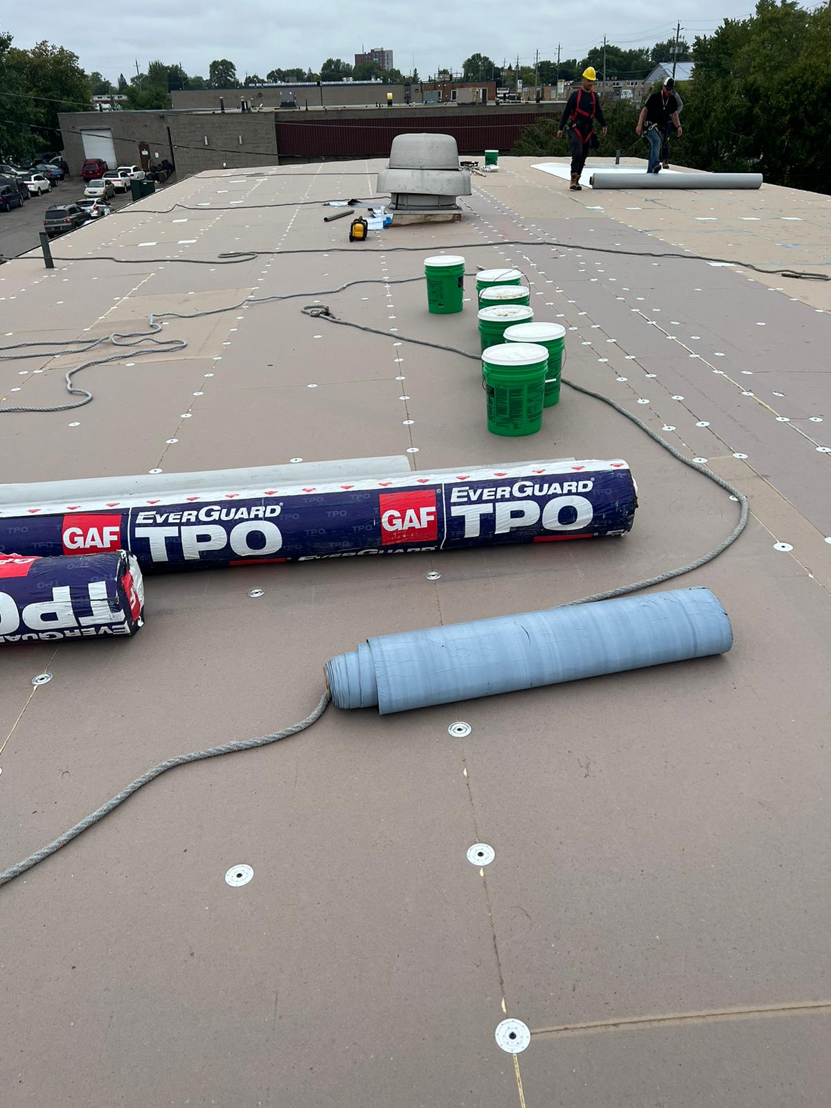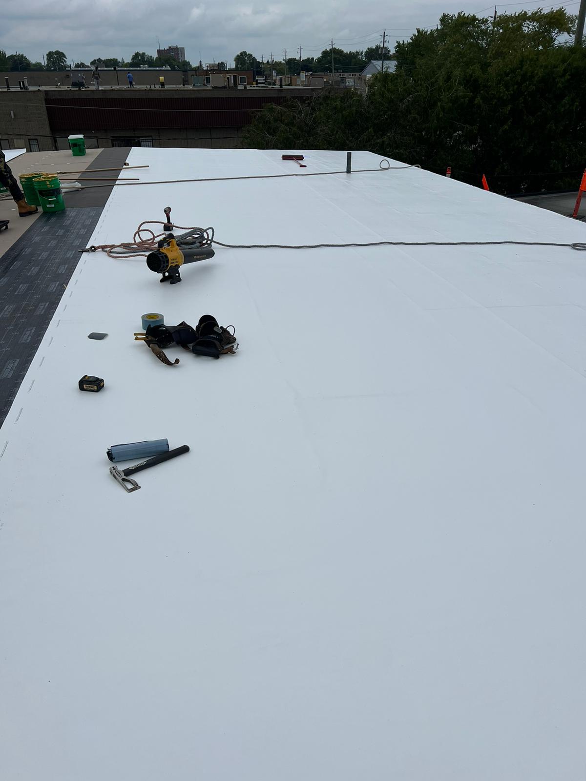 The TPO membrane can be attached to the cover board with a bonding adhesive or mechanically fastened. When the membrane is rolled out, the contractor returns and uses a hot-air gun to weld the seams together.
